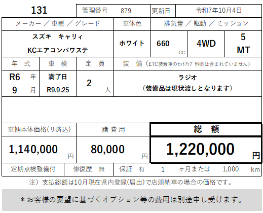 131 スズキ キャリィ KCエアコンパワステ 4WD 5MT 走行10km
