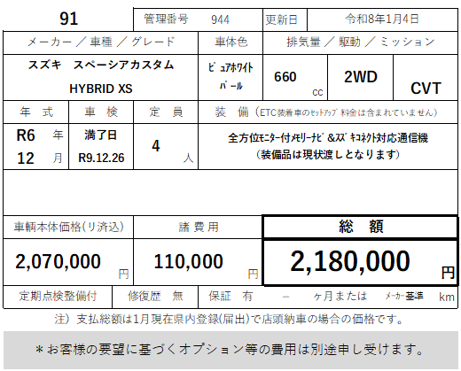 91 スズキ スペーシアカスタム HYBRID XS 走行10km