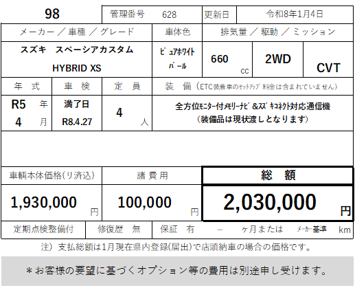 98 スズキ スペーシアカスタム HYBRID XS 走行10km