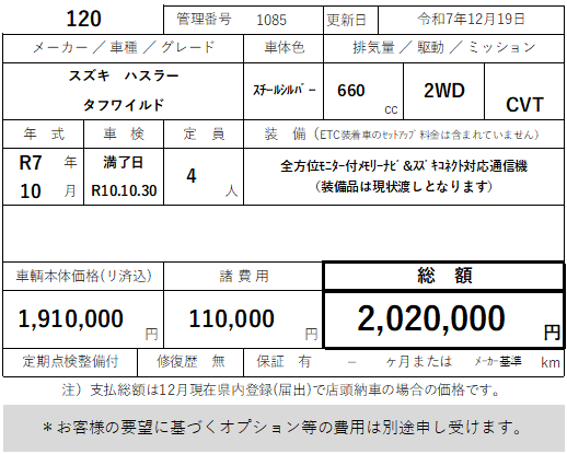 120 スズキ ハスラー タフワイルド 走行10km