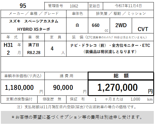 95 スズキ スペーシアカスタム HYBRID XSターボ 51,000km