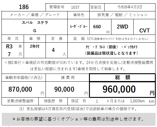 186 スバル ステラ G 走行10,700km