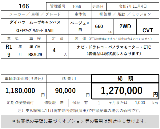 166 ダイハツ ムーヴキャンバス G メイクアップリミテッド SAⅢ 走行31,500km