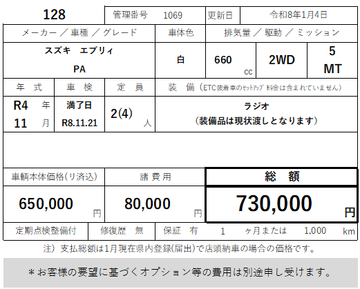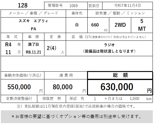 128 スズキ エブリィ PA 2WD 5MT 走行60,000km