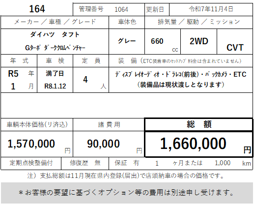 164 ダイハツ タフト Gターボダーククロムベンチャー 走行43,000km